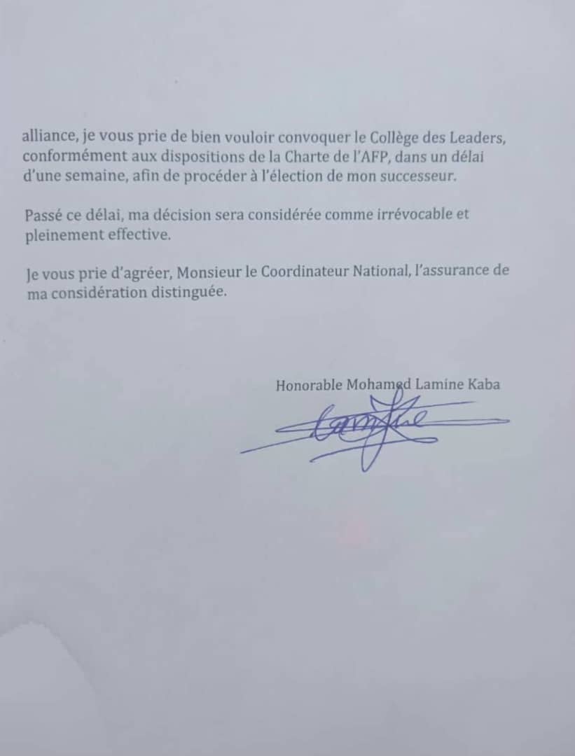 Mohamed Lamine Kaba, président du parti FIDEL et vice-coordinateur chargé de l’information et de la communication au sein de l’Alliance des Forces Patriotiques (AFP), a annoncé sa démission, de ses fonctions.