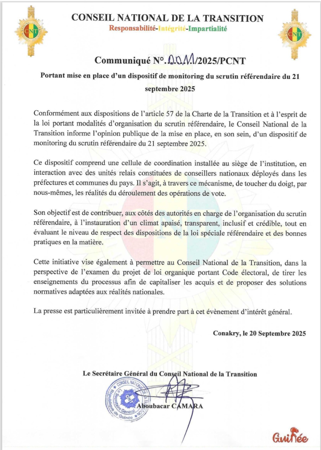 Conformément aux dispositions de l’article 57 de la Charte de la Transition et à l’esprit de la Loi portant modalités d’organisation du scrutin référendaire, le Conseil National de la Transition informe l’opinion publique de la mise en place, en son sein, d’un dispositif de monitoring du scrutin référendaire du 21 septembre 2025.