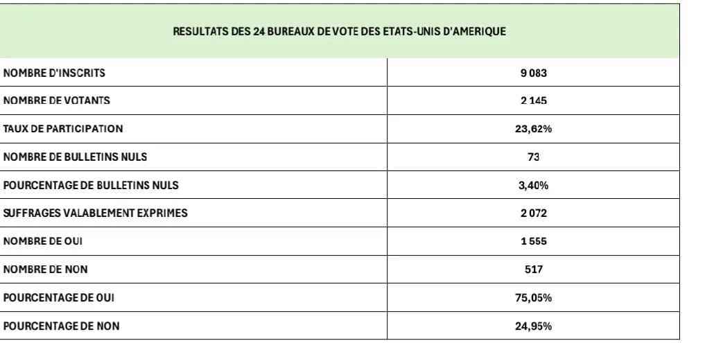Avec un taux de participation de 23,62% et un pourcentage de 75,05% des suffrages exprimés en faveur du « OUI », ces chiffres témoignent de l’adhésion majoritaire des électeurs guinéens établis en Amérique.