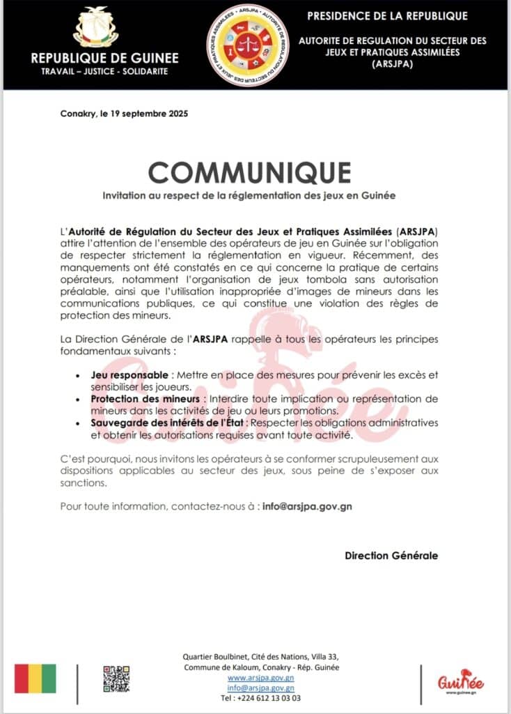 L’Autorité de Régulation du Secteur des Jeux et Pratiques Assimilées (ARSJPA) alerte les opérateurs sur des violations graves de la réglementation en vigueur, notamment l’usage non autorisé d’images de mineurs dans les communications et l’organisation illégale de jeux.