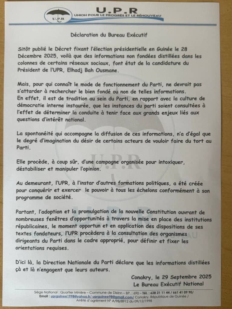 L’UPR rappelle que toute décision de cette envergure est soumise à une consultation de ses instances internes. Le parti affirme qu’en temps voulu, il définira sa position conformément à ses textes et à sa culture démocratique interne.