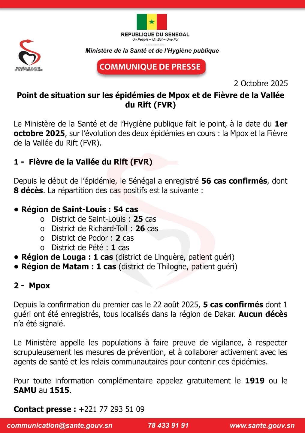 Le ministère de la Santé et de l’Hygiène publique a annoncé, ce 2 octobre 2025, la progression de deux épidémies sur le territoire national. La Fièvre de la Vallée du Rift (FVR) a déjà fait 56 cas confirmés, dont 8 décès, concentrés majoritairement dans la région de Saint-Louis.