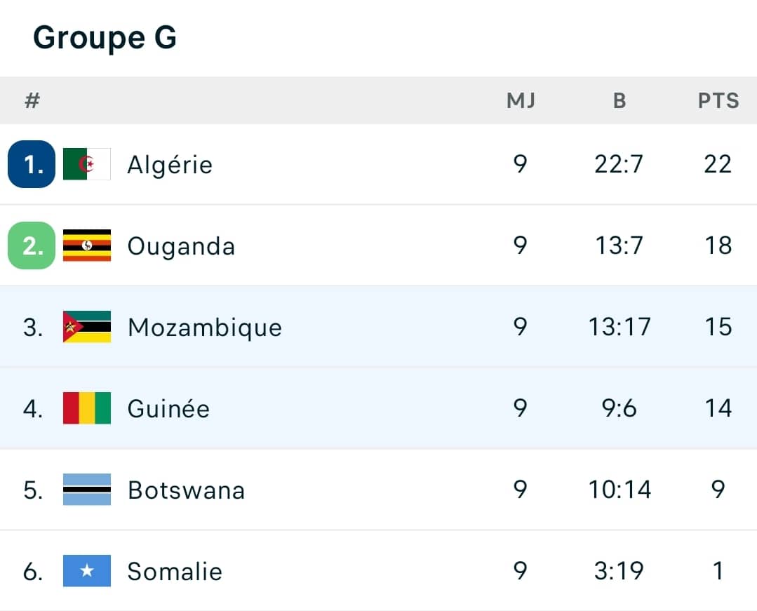 Avec cette victoire, le Syli National conforte sa 4ème place dans le groupe, totalisant désormais 14 points, derrière l’Algérie (22 points), déjà qualifiée pour le Mondial, l’Ouganda (18 points) et le Mozambique (15 points).