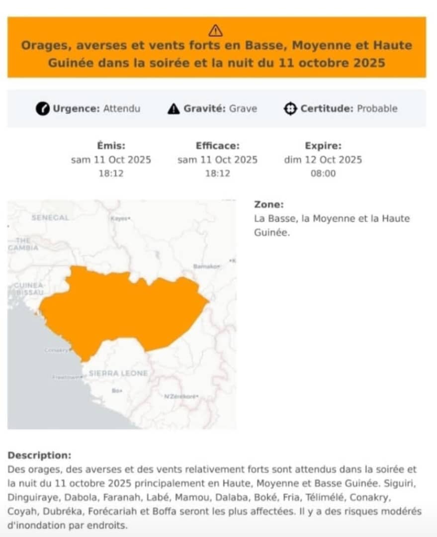 Les régions de la Basse, Moyenne et Haute Guinée sont placées en alerte, en raison des conditions météorologiques défavorables attendues dans la soirée et la nuit du samedi 11 octobre 2025. Des orages violents, de fortes averses et des vents soutenus, sont prévus sur une large partie du territoire.