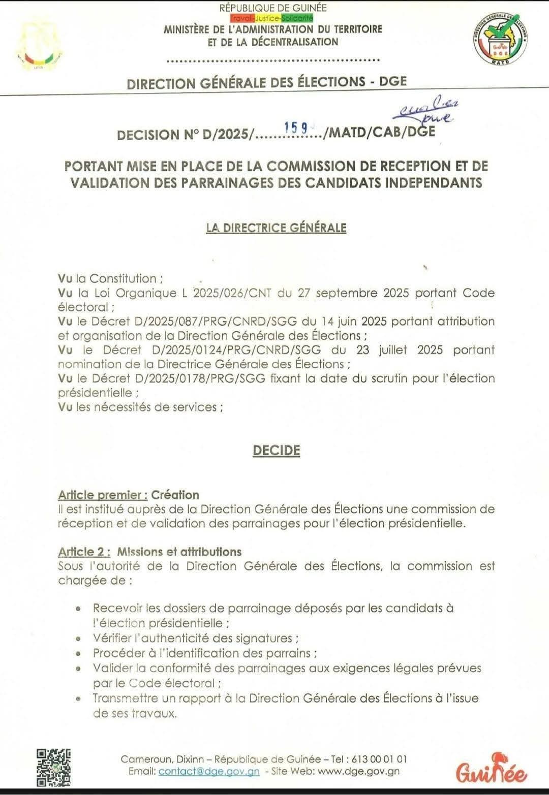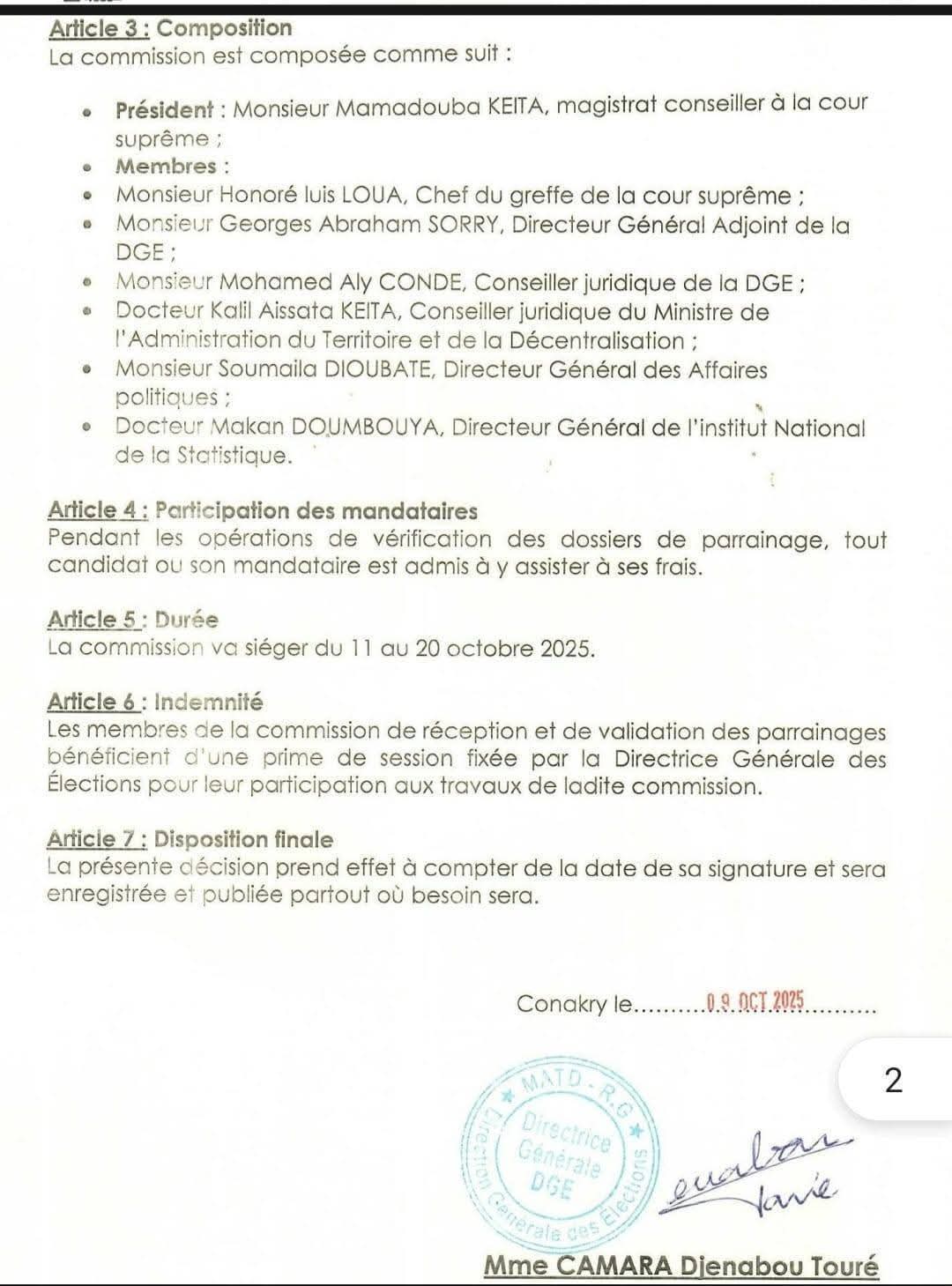 Dans le cadre de l’élection présidentielle prévue le dimanche 28 decembre 2025, la Direction Générale des Élections (DGE) a mis en place également, la Commission de réception et de validation des parrainages des candidats indépendants, présidée par Mamadouba KEITA, magistrat conseiller à la Cour suprême.