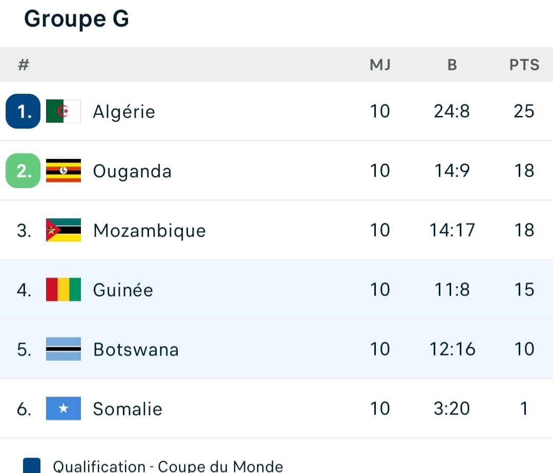 Avec ce nul, la Guinée termine à la 4e place du groupe G avec 15 points, derrière l’Algérie (25 pts), l’Ouganda (18 pts) et le Mozambique (18 pts). Le Botswana ferme la marche avec 10 points, tandis que la Somalie finit dernière avec un seul point.