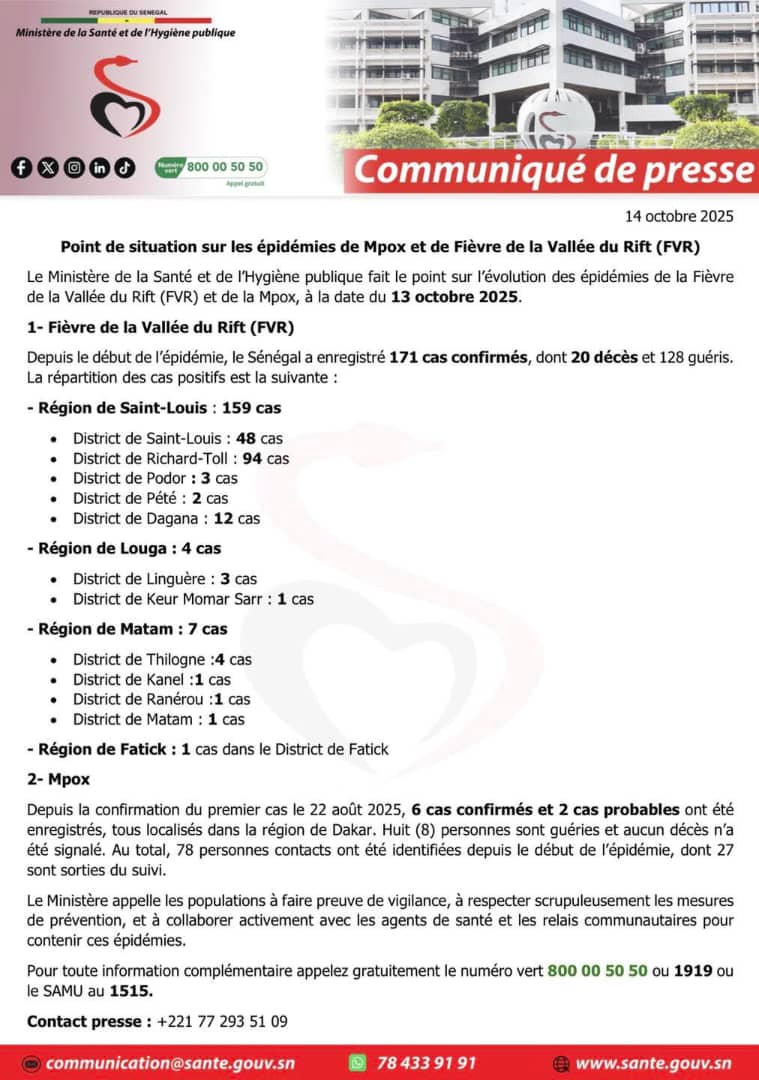 À la date du 13 octobre 2025, 171 cas de FVR ont été confirmés, avec 20 décès et 128 guérisons, principalement dans la région de Saint-Louis. Pour la Mpox, 6 cas confirmés et 2 cas probables ont été recensés à Dakar, sans décès. Huit personnes sont guéries.