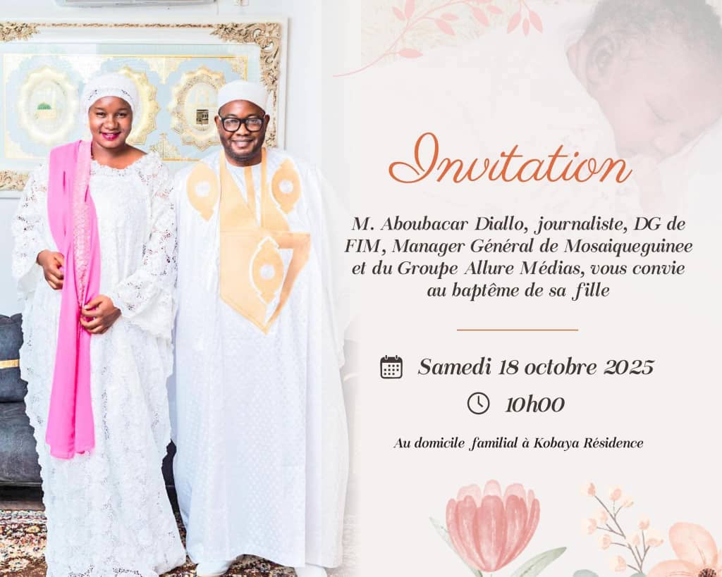 Le célèbre journaliste Aboubacar Diallo, Manager Général de Mosaiqueguinee et du Groupe Allure Médias, a le plaisir d’annoncer le baptême de sa fille. La cérémonie se déroulera le samedi 18 octobre 2025 à 10h00, au domicile familial à Kobaya Résidence.