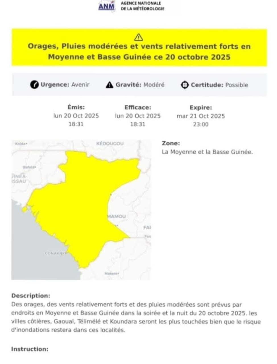 L’Agence Nationale de la Météorologie a émis ce lundi 20 octobre 2025, une alerte à haut risque pour la Moyenne et la Basse Guinée. Des orages accompagnés de pluies modérées et de vents relativement forts sont attendus dans la nuit, notamment à Conakry, Mamou, Gaoual, Télimélé et Koundara.