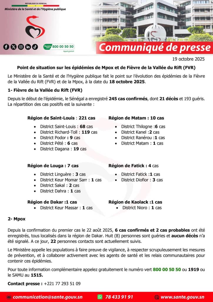 Au 18 octobre 2025, le Sénégal a enregistré 245 cas confirmés de Fièvre de la Vallée du Rift (FVR), dont 21 décès et 193 guérisons. La région de Saint-Louis reste l’épicentre, avec 221 cas.