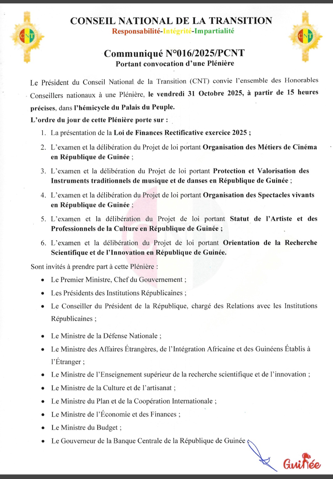 Le Président du Conseil National de la Transition (CNT) convoque une plénière pour ce vendredi 31 octobre 2025 à 15 heures, dans l’hémicycle du Palais du Peuple.