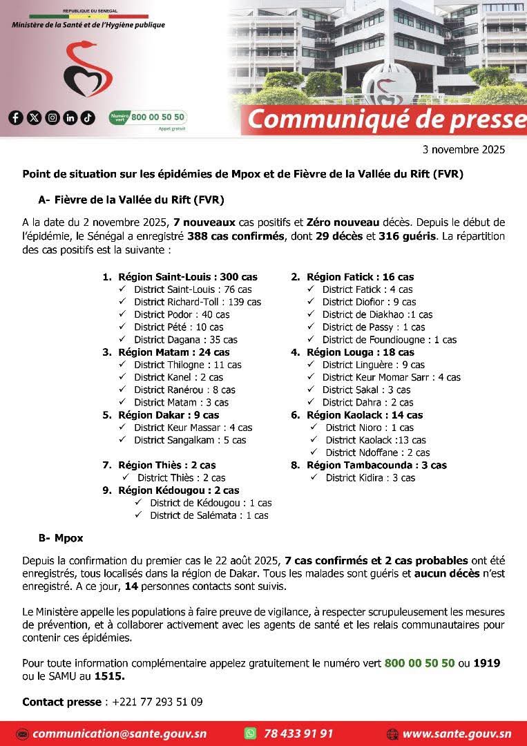 Au 2 novembre 2025, le Sénégal dénombre 388 cas confirmés de Fièvre de la Vallée du Rift, dont 29 décès et 316 guérisons, la majorité des cas étant concentrée dans la région de Saint-Louis. Les autres régions touchées incluent Matam, Fatick, Louga, Dakar, Kaolack, Thiès, Tambacounda et Kédougou.