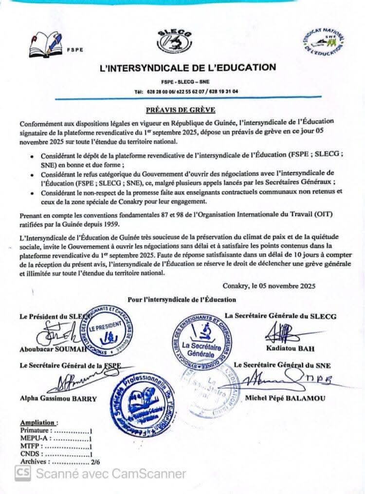 L’intersyndicale de l’Éducation, composée du FSPE, du SLECG et du SNE, a annoncé ce mercredi 5 novembre 2025 le dépôt d’un préavis de grève couvrant tout le territoire national. Selon le communiqué consulté par Allureinfo.net, cette décision fait suite à plusieurs démarches restées sans suite auprès du gouvernement, notamment sur la signature et l’application du statut particulier des enseignants du pré-universitaire, ainsi que sur la satisfaction d’autres revendications professionnelles.