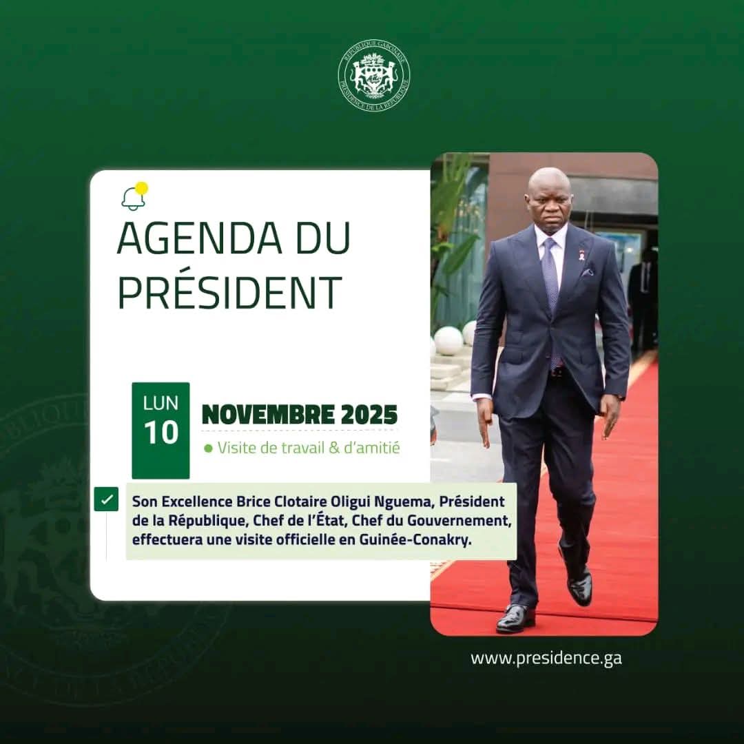 Le président gabonais, Brice Clotaire Oligui Nguema, se rendra à Conakry ce lundi 10 novembre 2025 pour une visite de travail et d’amitié, a annoncé la présidence gabonaise.
