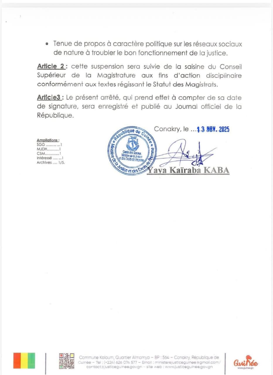 Le Garde des Sceaux, Ministre de la Justice et des Droits de l’Homme, a pris un arrêté en date du 13 novembre 2025 suspendant le magistrat Kaman Gogana KONOMOU, juge d’instruction au Tribunal pour enfants de Conakry.