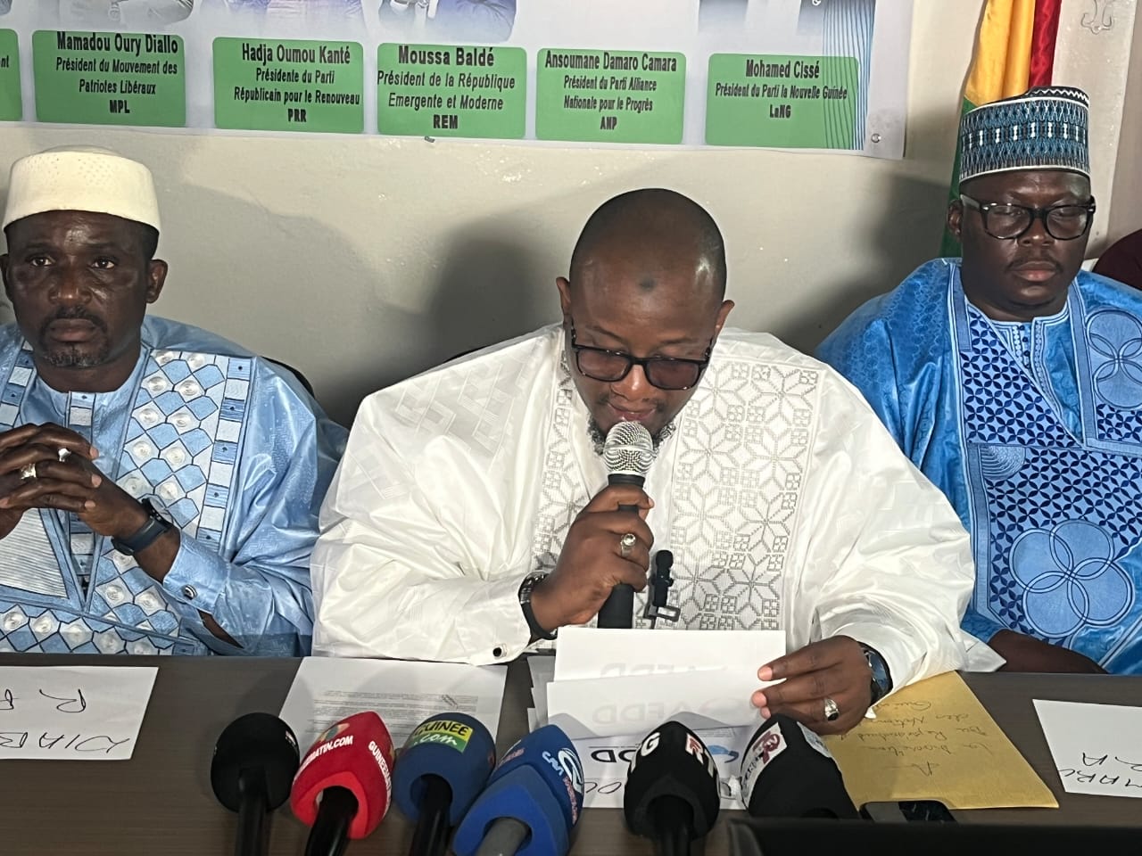 Composée de plusieurs leaders politiques, Diabaty Doré (RPR), Mamadou Oury Diallo (MPL), Moussa Baldé (REM), Ansoumane Damaro Camara (ANP), Mohamed Cissé (NG) et Hadja Oumou Kanté (PRR), l’alliance a rendu publique sa déclaration, lue par le président du Mouvement des Patriotes Libéraux (MPL).