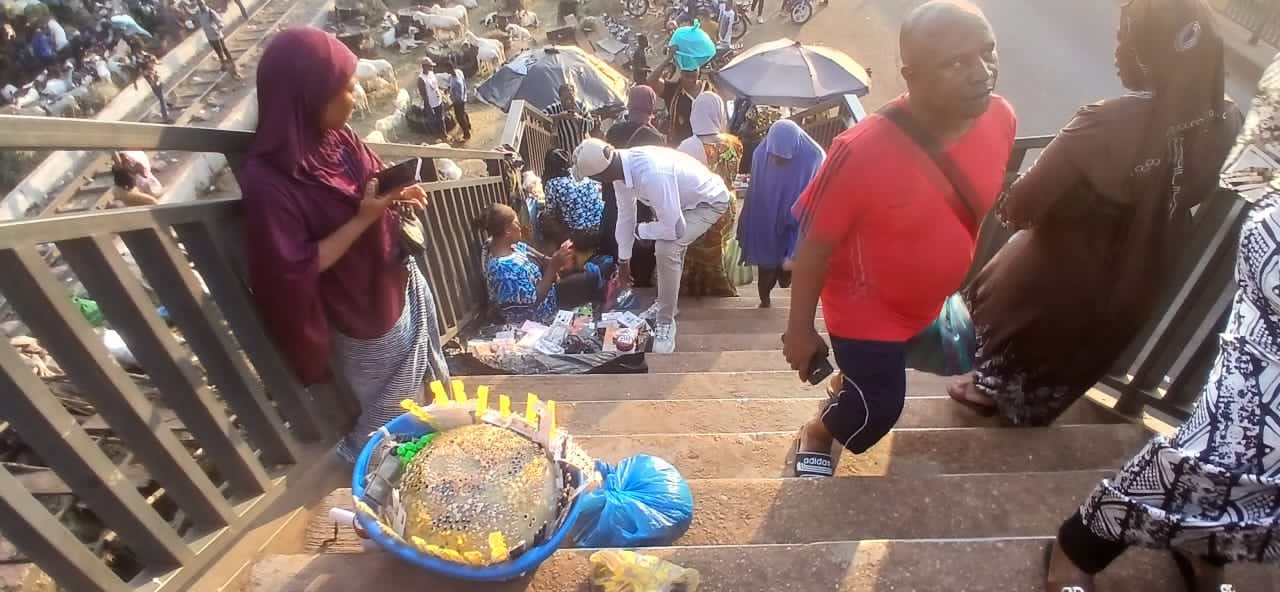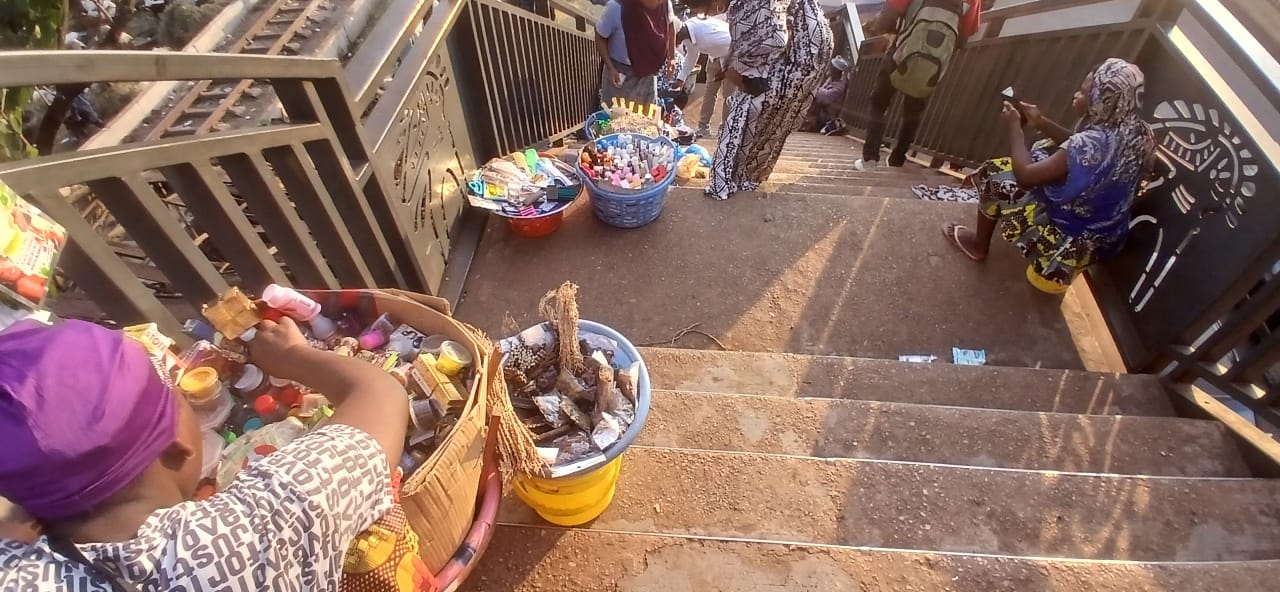 Vendredi 14 novembre 2025, vers 18 heures, notre équipe s’est rendue sur place. Sur la passerelle, femmes et hommes ont installé étals et paniers débordant de balais, condiments, herbes médicinales et médicaments. Chaque marche devient un obstacle, tandis que les vendeuses écoulent leurs produits au milieu des flux de piétons.
