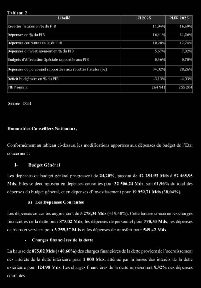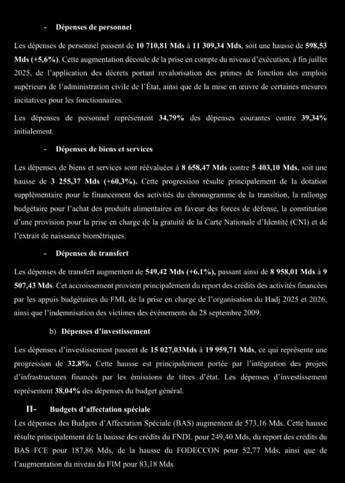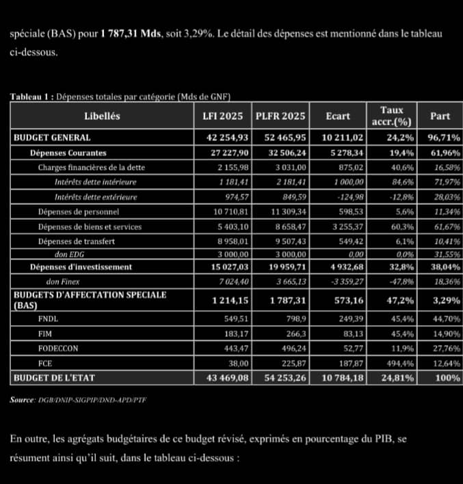 À l’issue de ces ajustements, la prévision globale des dépenses de l’État pour l’exercice 2025 est portée à 54 253,26 milliards de francs guinéens, soit une hausse de 10 784,18 milliards de francs guinéens, équivalant à +24,81 % par rapport aux prévisions initiales.