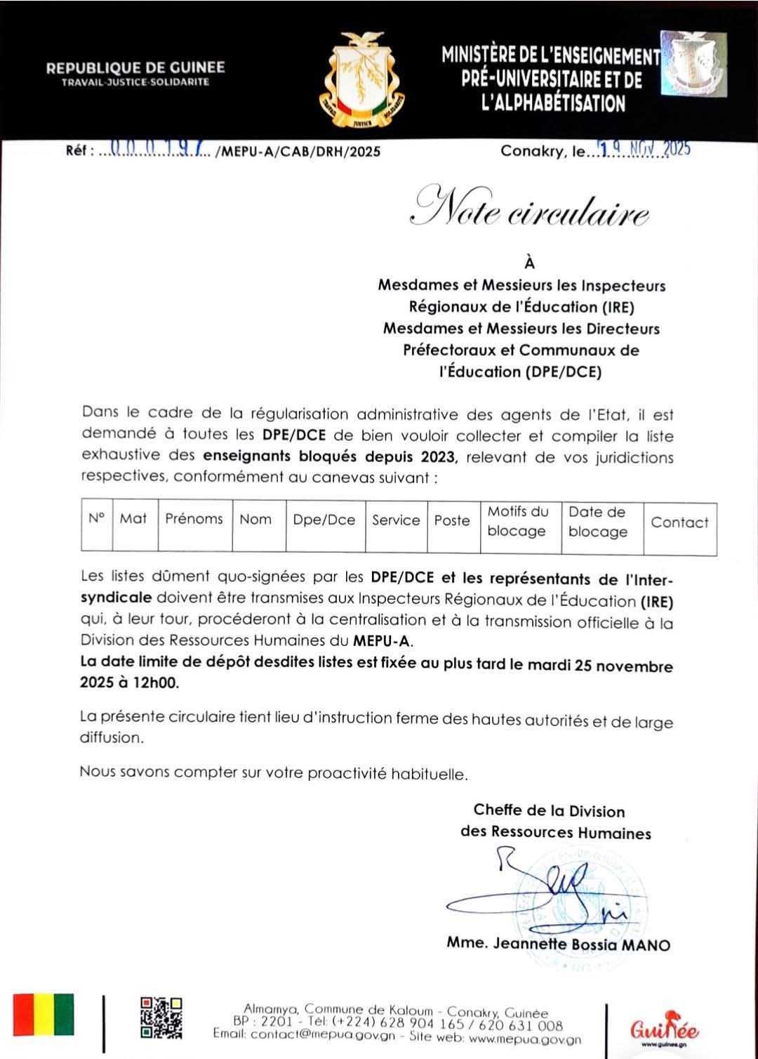 Dans une circulaire adressée aux Inspecteurs Régionaux de l’Éducation (IRE) ainsi qu’aux Directeurs Préfectoraux et Communaux de l’Éducation (DPE/DCE), le ministère demande la collecte et la compilation urgentes de la liste exhaustive des enseignants bloqués depuis 2023 au sein de leurs juridictions.