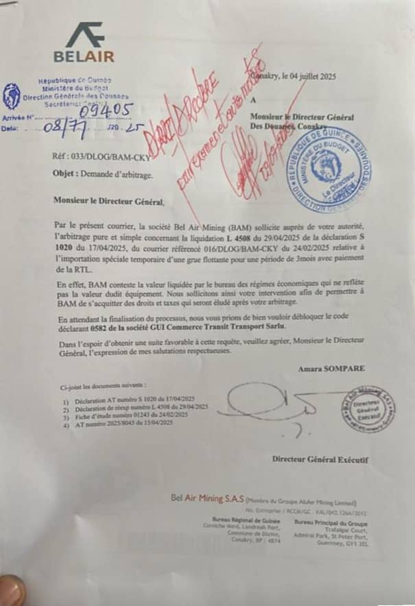 La société Bel Air Mining (BAM) demande officiellement au Directeur général des Douanes, un arbitrage concernant la liquidation L 4508 liée à la déclaration S 1020, portant sur l’importation spéciale temporaire d’une grue flottante.