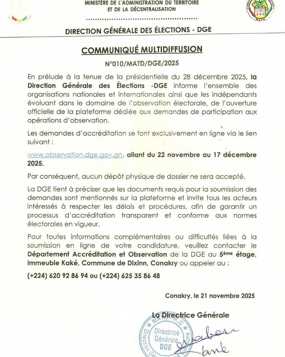 A un peu plus d’un mois de la présidentielle prévue le 28 décembre 2025, la Direction Générale des Élections (DGE) annonce l’ouverture officielle de sa plateforme dédiée aux demandes d’accréditation des observateurs nationaux, internationaux et indépendants.