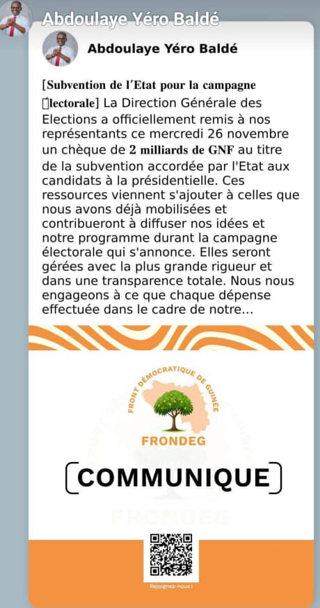 Moins de 24 heures plus tard, le FRONDEG d’Abdoulaye Yéro Baldé a levé toute ambiguïté: « La DGE a officiellement remis un chèque de 2 milliards GNF à nos représentants », annonce le parti, confirmant ainsi la subvention destinée à soutenir les campagnes électorales des candidats engagés dans la course au fauteuil présidentiel.