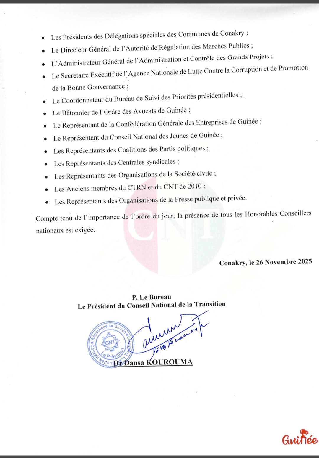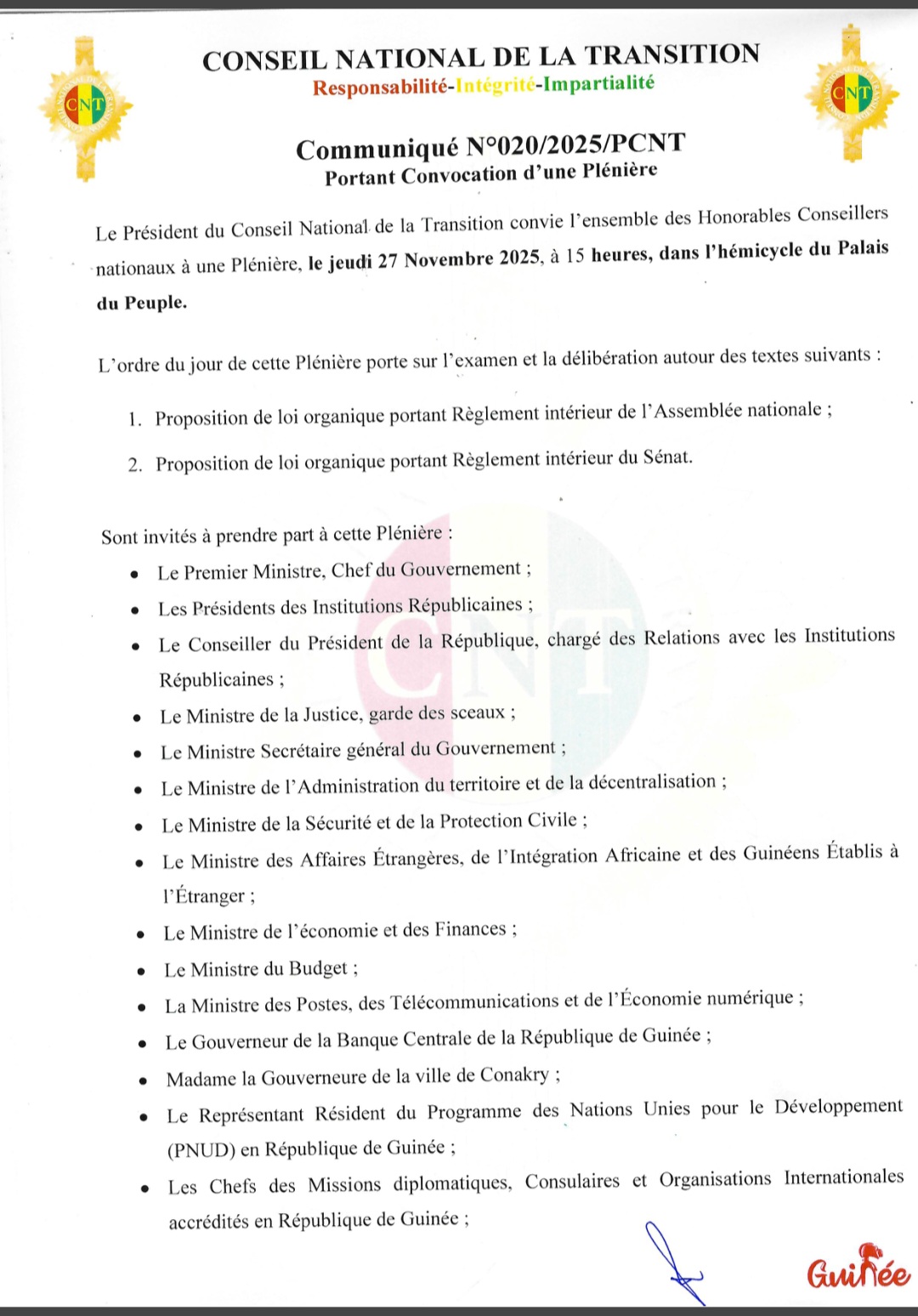 Le Conseil National de la Transition (CNT) tiendra une plénière majeure ce jeudi 27 novembre 2025 à 15 heures, dans l’hémicycle du Palais du Peuple. D’après le communiqué signé du président de l’institution, Dansa Kourouma, la session sera consacrée à l’examen et à la délibération de deux textes essentiels : la proposition de loi organique portant règlement intérieur de l’Assemblée nationale et celle portant règlement intérieur du Sénat.