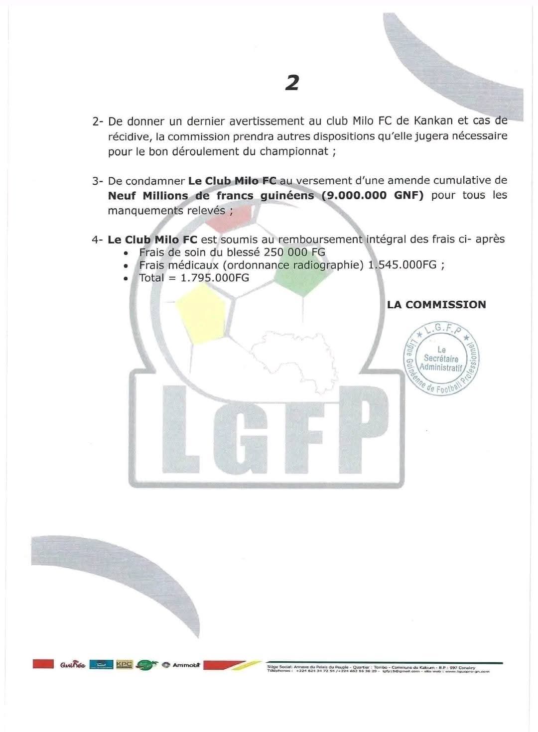 2. Une amende cumulative de 13 millions de francs guinéens (13.000.000 GNF) pour les interruptions du match et l’usage de fumigènes et projectiles.