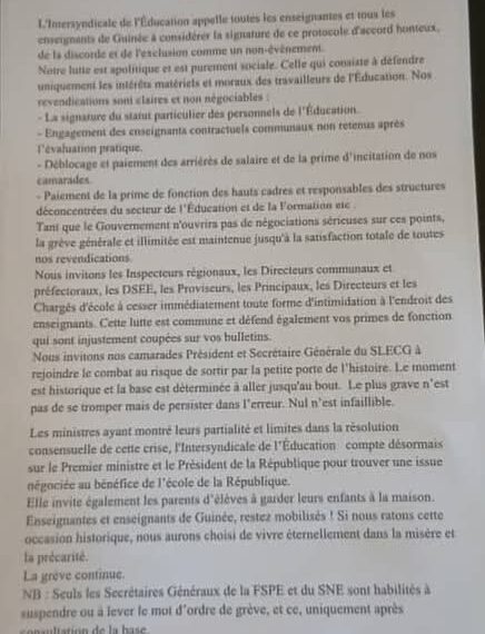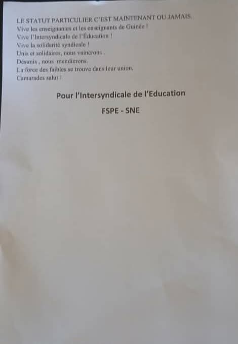 L’Intersyndicale de l’Éducation FSPE–SNE fustige la signature du protocole d’accord conclu entre le gouvernement guinéen et le SLECG, qu’elle qualifie « d’amateurisme consternant » et de « non-événement ».