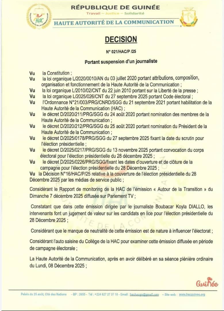 La Haute Autorité de la Communication (HAC) a annoncé la suspension de Boubacar Koyla Diallo, animateur de l’émission « Autour de la Transition », diffusée sur Parlement TV.