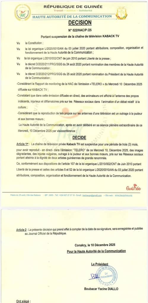 La Haute Autorité de la Communication (HAC) a suspendu pour trois mois, la chaîne privée Kaback TV après la diffusion en direct, dans l’émission « TELERO » du 10 décembre 2025, de propos jugés injurieux, indécents et diffamatoires, repris des réseaux sociaux.