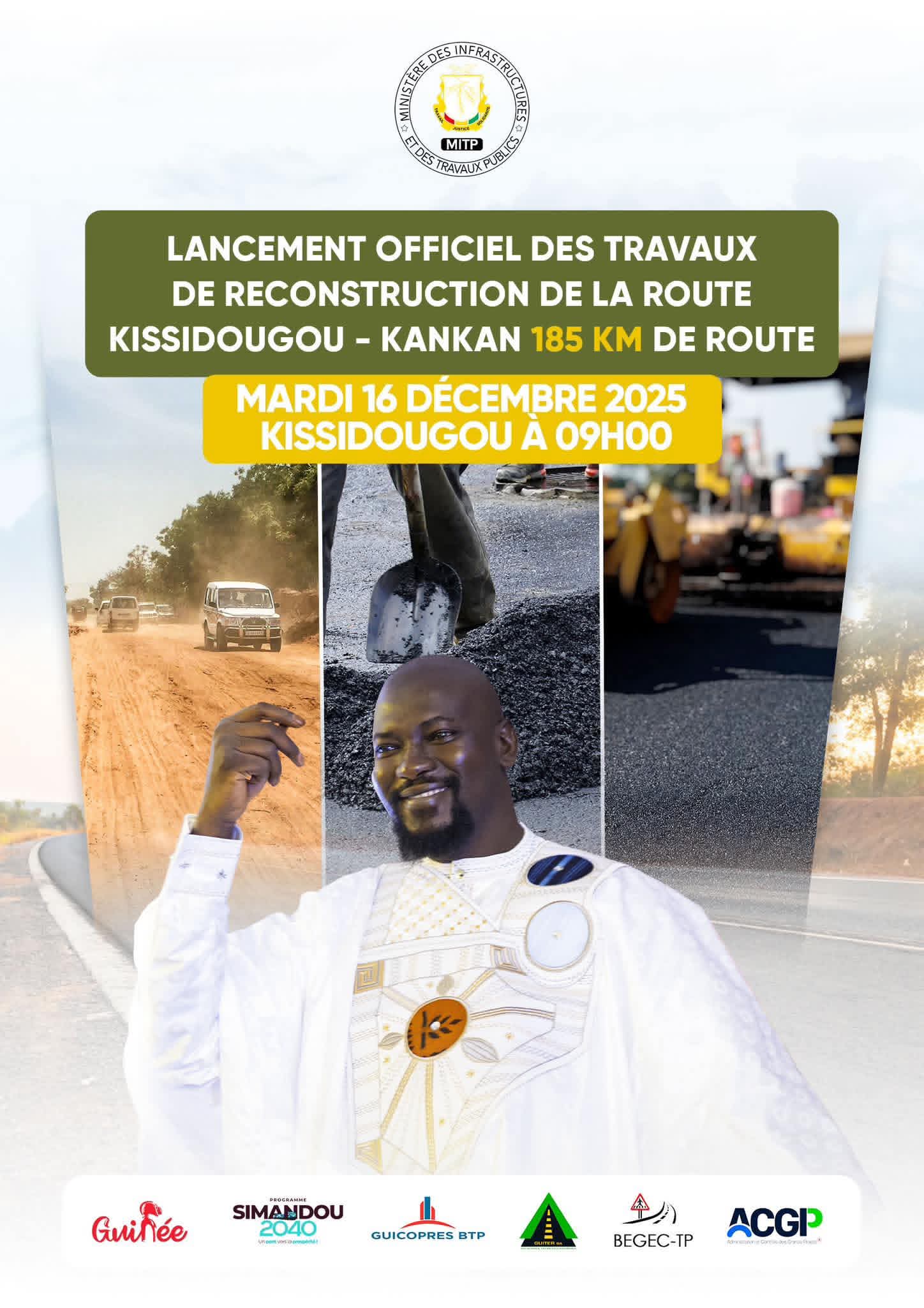 La cérémonie est prévue le mardi 16 décembre 2025 à Kissidougou. Selon le département, ce projet structurant vise à améliorer durablement la mobilité des personnes et des biens, à renforcer l’intégration régionale entre la Haute-Guinée et la Guinée forestière, et à stimuler le développement économique et social des localités traversées.