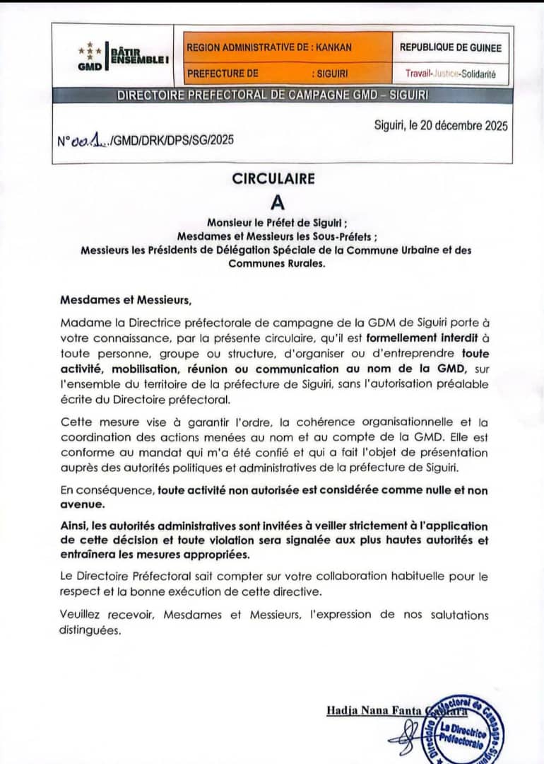 À Siguiri, le Directoire préfectoral de campagne du GMD hausse le ton. Dans une circulaire datée du 20 décembre 2025, la direction locale du mouvement annonce l’interdiction formelle de toute activité menée en son nom sans autorisation préalable.