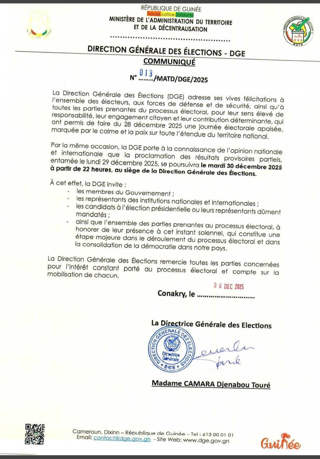 Dans un communiqué qui vient de nous parvenir, la DGE, l’organe en charge des élections en Guinée, annonce qu’elle poursuivra cette nuit, à partir de 22h, la proclamation des résultats provisoires partiels de l’élection présidentielle du 28 décembre.