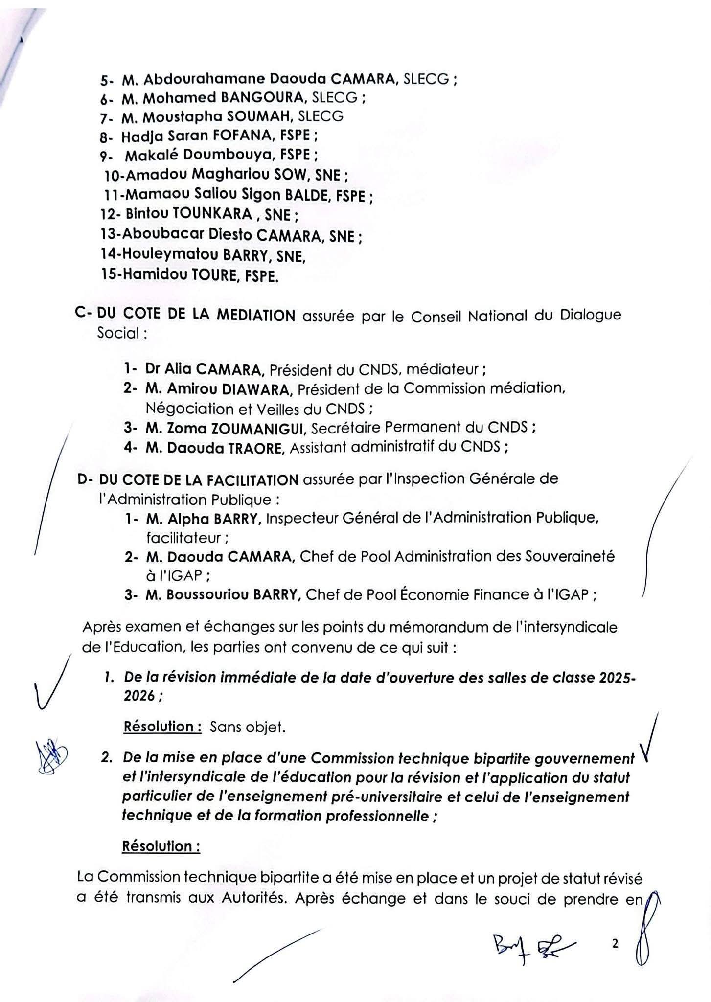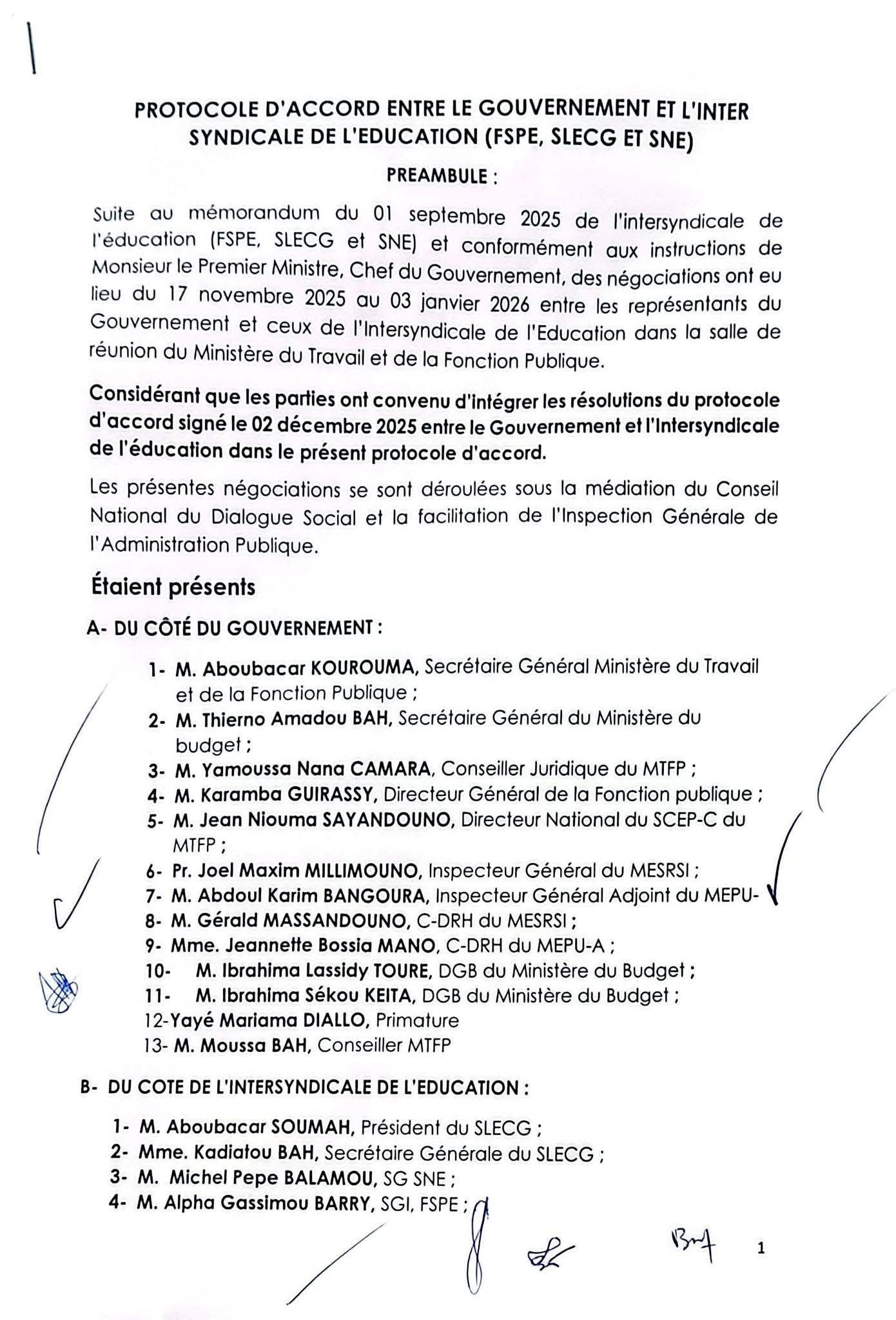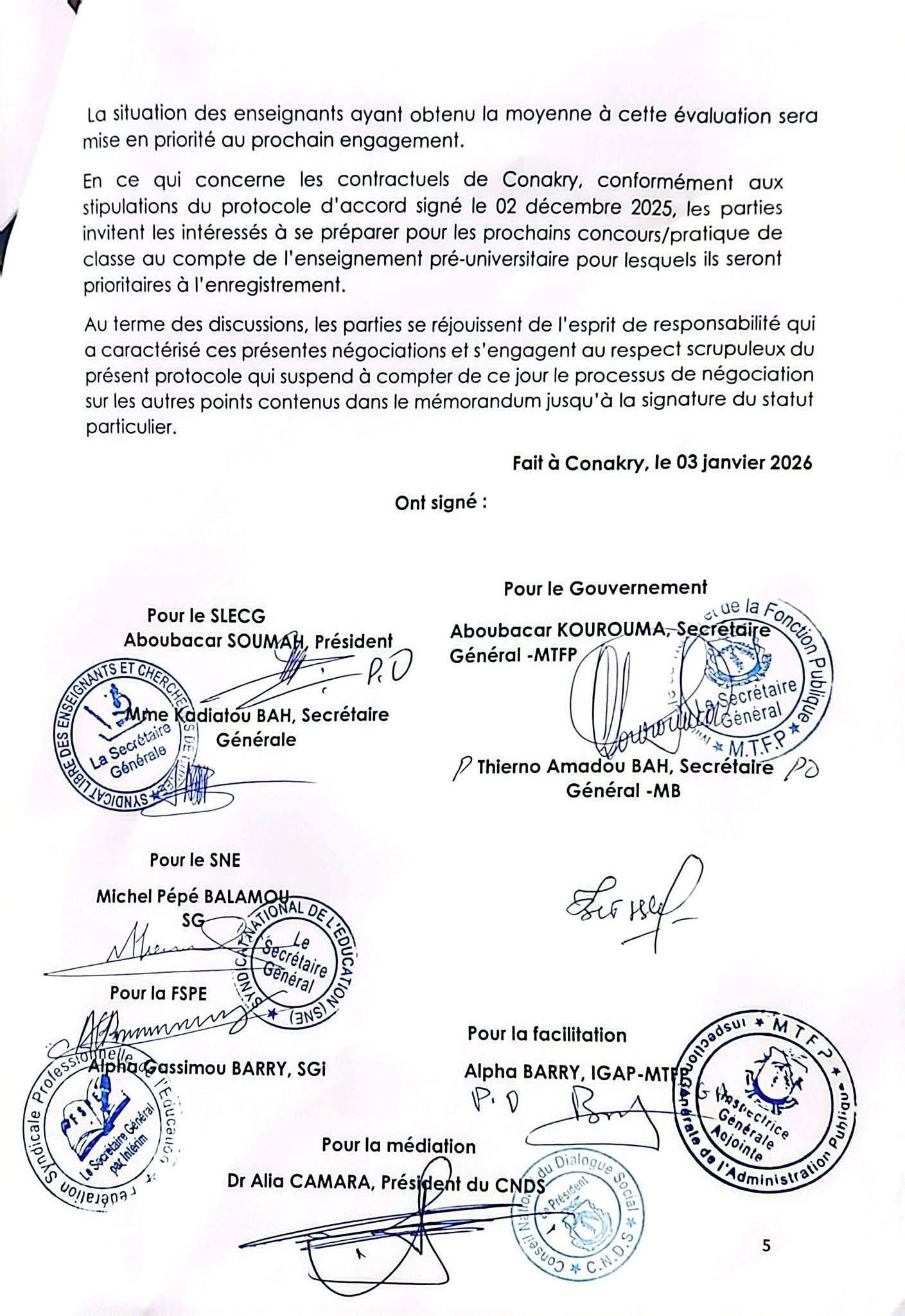 Le Gouvernement et l’Intersyndicale de l’Éducation (FSPE, SLECG, SNE) ont signé un protocole d’accord historique, marquant une étape importante pour apaiser la crise qui secoue le secteur éducatif en Guinée.