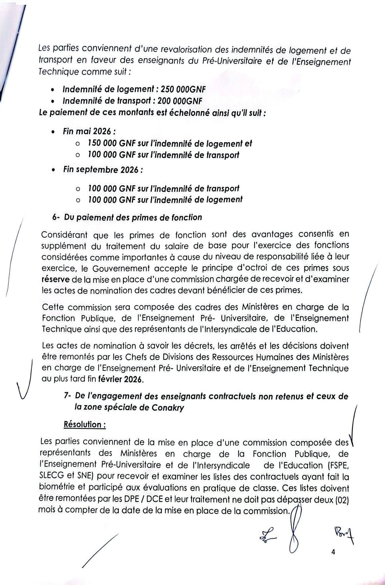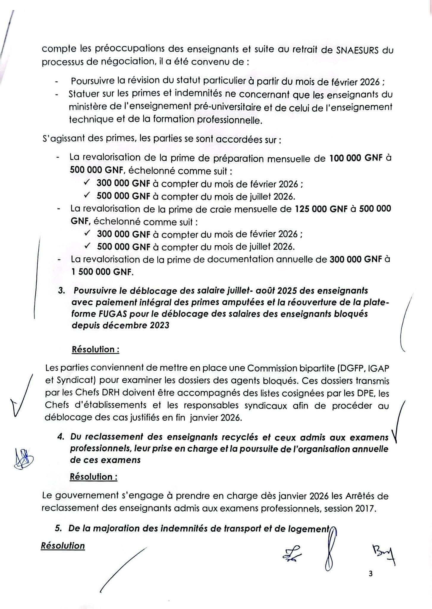 Parmi les principales résolutions de cet accord, figure la revalorisation des primes des enseignants. La prime de préparation mensuelle sera réajustée à 300 000 GNF à partir de février 2026, puis à 500 000 GNF dès juillet 2026.