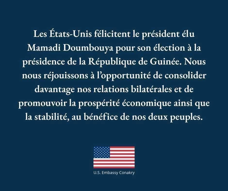 Les États-Unis ont officiellement adressé leurs félicitations à Mamadi Doumbouya, élu président de la République de Guinée. Dans un message publié par l’ambassade américaine à Conakry, Washington salue l’accession du nouveau chef de l’État à la magistrature suprême et exprime sa volonté de renforcer les relations bilatérales entre les deux pays.