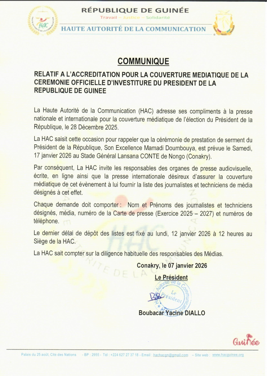 La Haute Autorité de la Communication (HAC) annonce l’ouverture de la procédure d’accréditation pour la couverture médiatique de la cérémonie officielle d’investiture du président de la République, Mamadi Doumbouya, prévue le 17 janvier 2026 au stade Général Lansana Conté de Nongo.