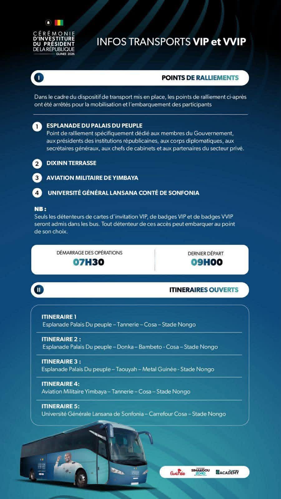 À l’occasion de la cérémonie d’investiture du Président de la République, le Général Mamadi Doumbouya, un dispositif spécial de transport est déployé pour les invités VIP et VVIP.