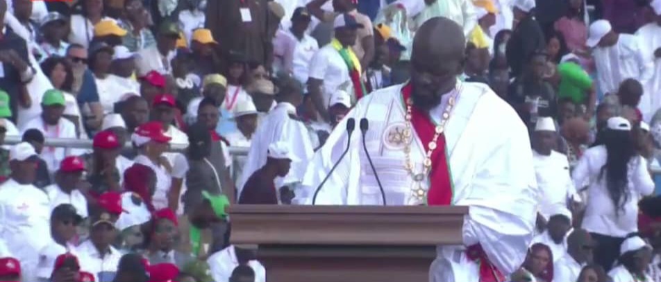 La main levée, le président Mamadi Doumbouya déclare d’une voix ferme: « Moi, président de la République élu, je jure devant Dieu et devant le peuple de Guinée, sur mon honneur, de respecter et de faire respecter scrupuleusement la Constitution, les lois, les règlements et les décisions de justice ; d’exercer loyalement et dignement les fonctions qui me sont conférées dans l’intérêt supérieur de la nation ; de ne jamais recourir aux pouvoirs qui me sont dévolus à des fins personnelles ; de préserver en tout lieu et en toutes circonstances, la paix, la cohésion sociale et l’unité nationale ; de défendre les institutions de la République, l’intégrité du territoire et l’indépendance nationale. En cas de parjure, que je subisse la rigueur de la loi. »