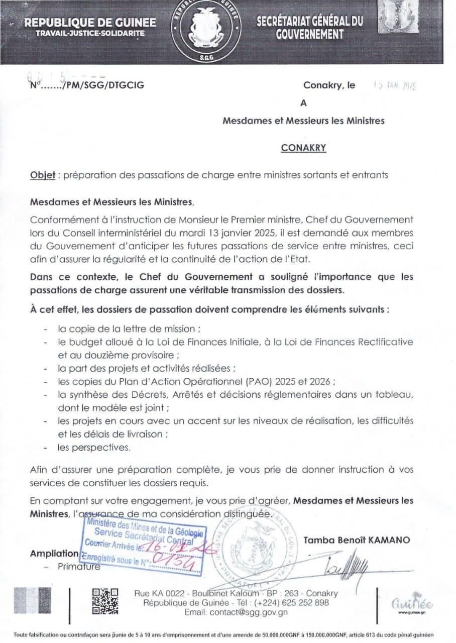 Dans une correspondance, le Secrétariat général du gouvernement, sur instruction du Premier ministre Bah Oury, demande aux membres du gouvernement de constituer des dossiers complets afin de garantir la continuité de l’action publique.