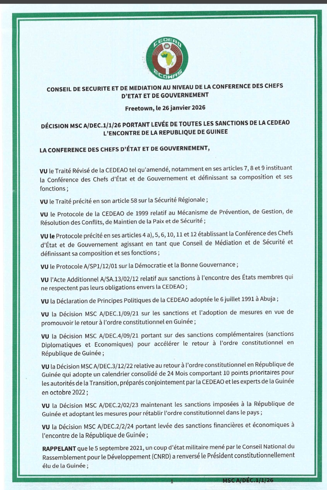Selon un communiqué officiel de deux pages publié à l’issue d’un sommet des chefs d’État et de gouvernement, la Communauté économique des États de l’Afrique de l’Ouest (CEDEAO) a décidé de lever intégralement, avec effet immédiat, les sanctions imposées à la République de Guinée depuis le 05 septembre 2021.