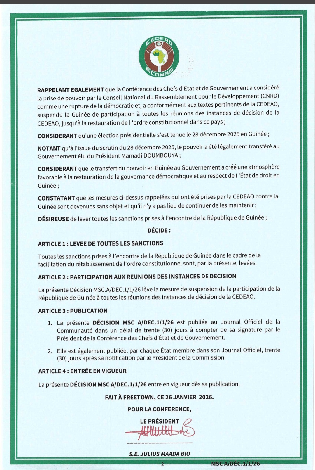 La Guinée retrouve ainsi sa pleine participation aux instances de l’organisation sous-régionale.