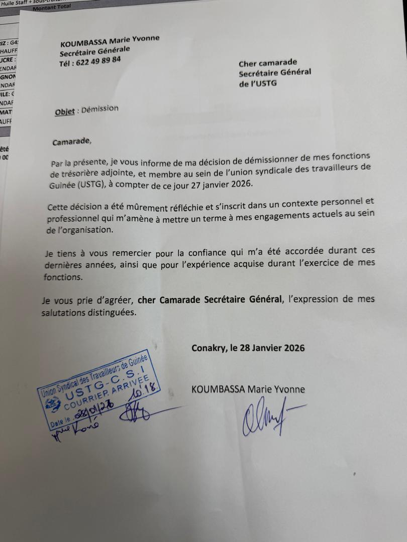 L’Union syndicale des travailleurs de Guinée (USTG) a enregistré un changement notable au sein de sa direction. Marie-Yvonne Koumbassa a officiellement annoncé sa démission de ses fonctions de trésorière adjointe et de membre du bureau exécutif.