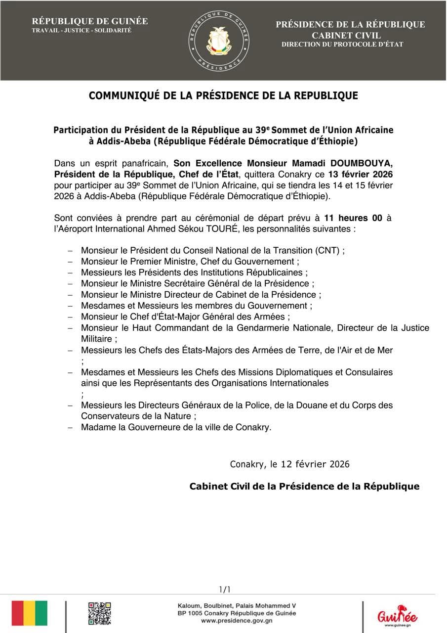 À travers un communiqué rendu public ce jeudi 11 février 2026, la Présidence de la République annonce que le président Doumbouya, quittera Conakry ce vendredi 13 février pour participer au 39e Sommet de l’Union Africaine, prévu les 14 et 15 février à Addis-Abeba, en Éthiopie.