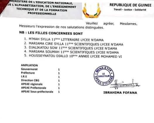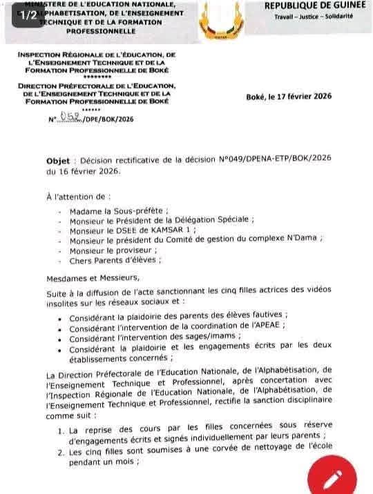 La Direction Préfectorale de l’Éducation de Boké a publié, le 17 février 2026, une décision rectifiant les sanctions initiales contre cinq élèves des lycées N’Dama et Mohamed VI.