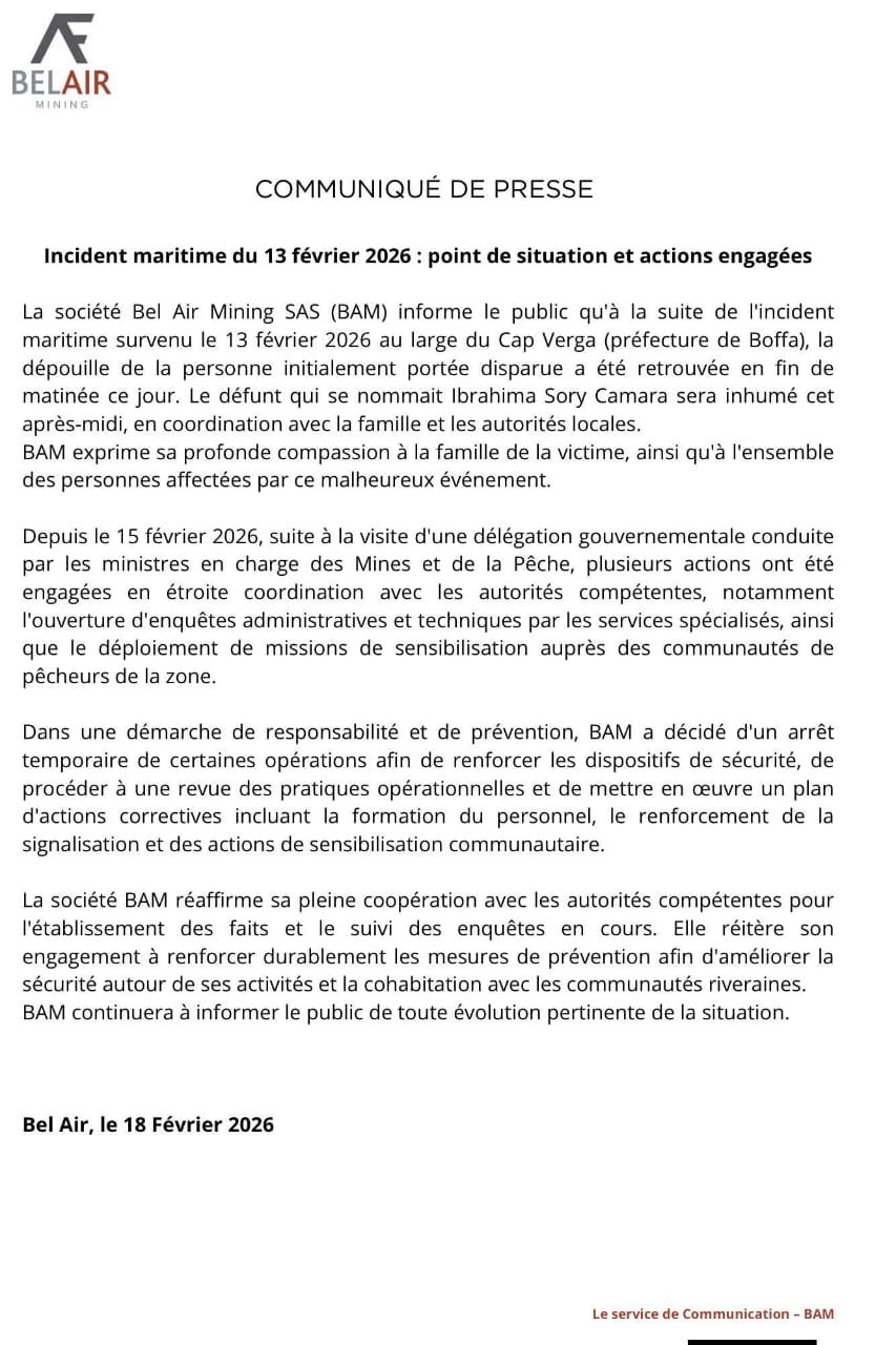 L’incident impliquant une barge de Bel Air Mining SAS et une pirogue de pêche artisanale a déclenché l’ouverture d’enquêtes administratives et techniques, ainsi que des missions de sensibilisation auprès des communautés locales.