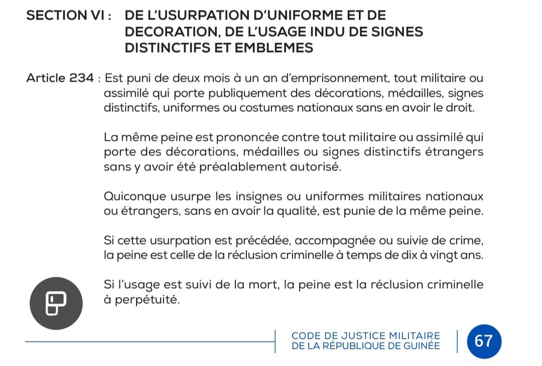 En République de Guinée, le port illégal d’uniforme militaire constitue une infraction grave réprimée par le Code de justice militaire.