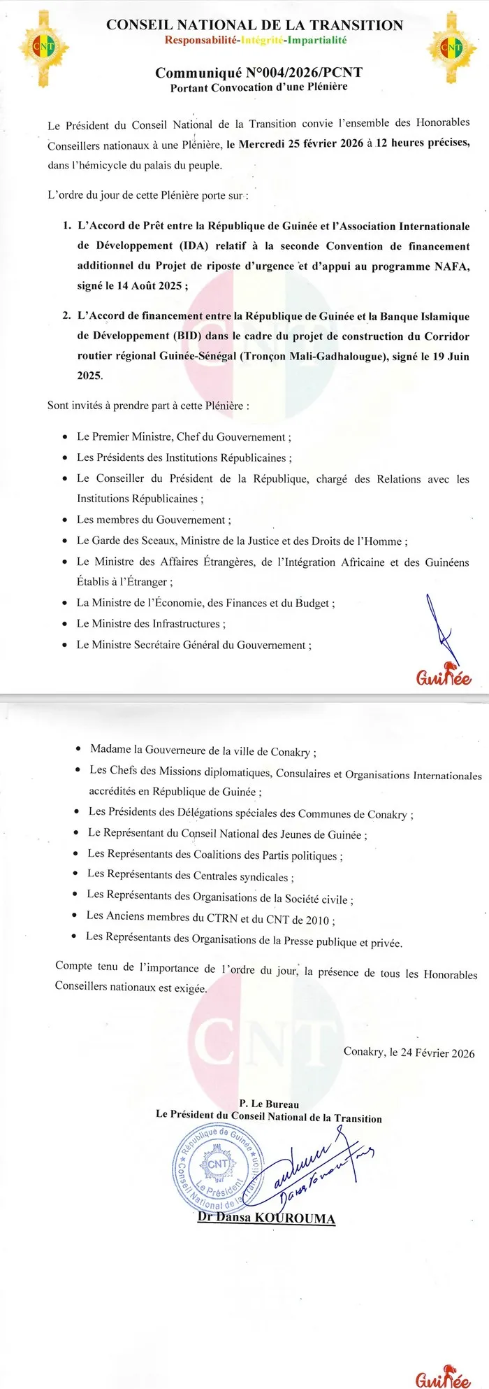 Le Président du Conseil National de la Transition (CNT), le Dr Dansa Kourouma, convoque les conseillers nationaux en séance plénière ce mercredi 25 février 2026, à 12 heures, au Palais du Peuple.