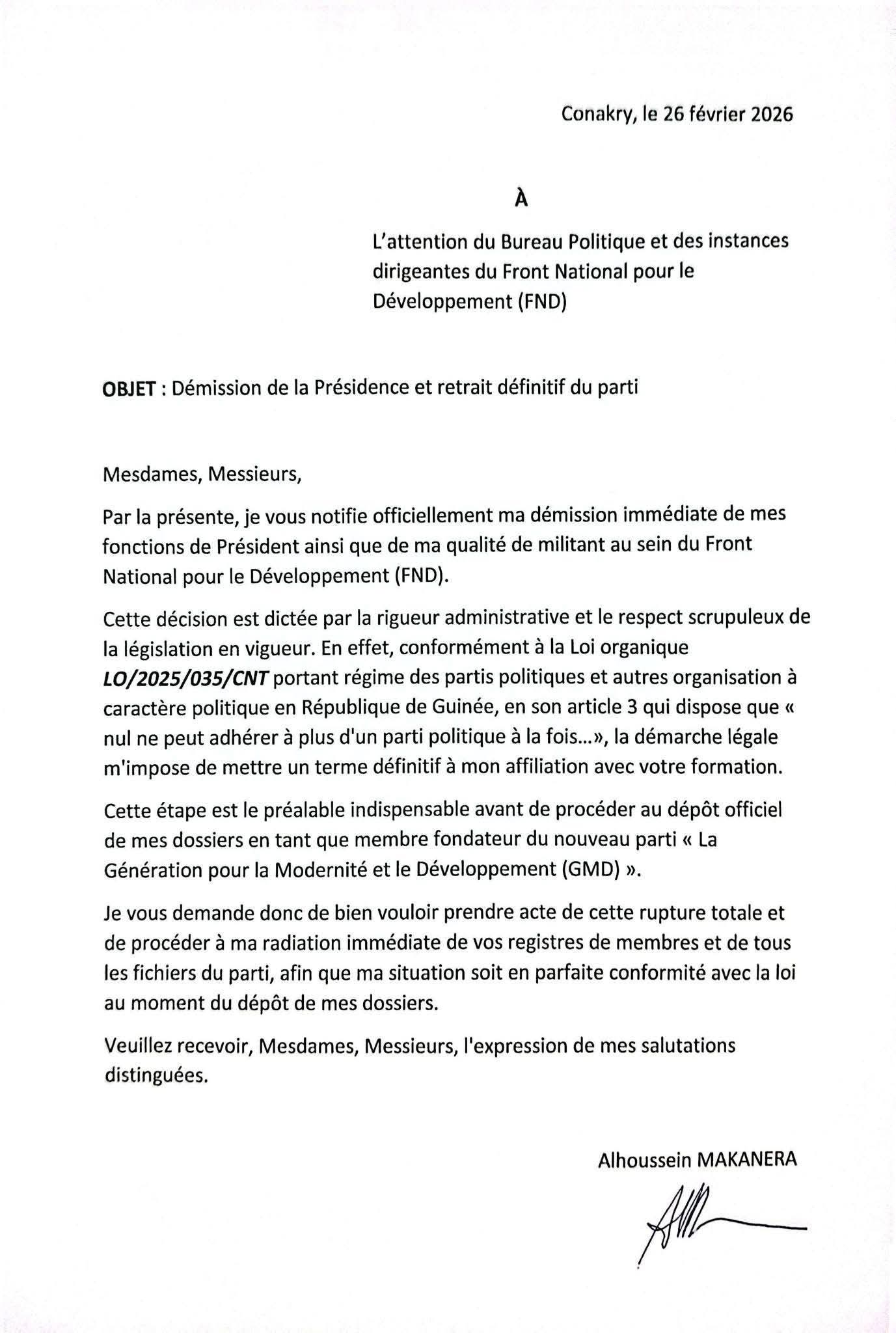Alhoussein Makanéra Kaké a annoncé sa démission immédiate de la présidence du Front national pour le développement (FND), ainsi que son retrait définitif du parti.